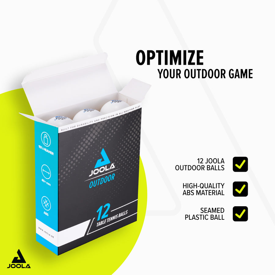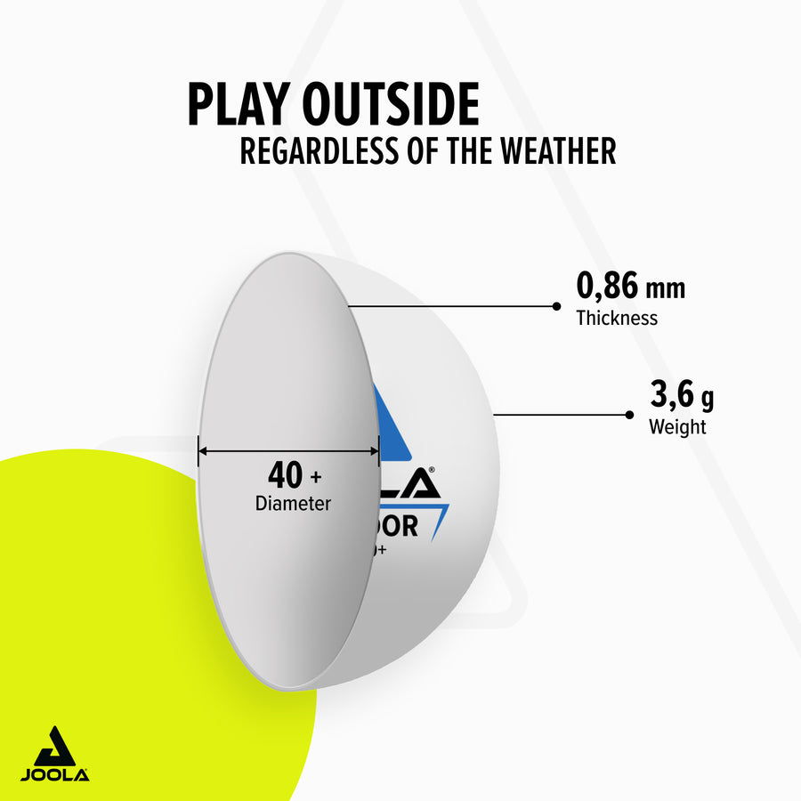 The JOOLA OUTDOOR table tennis ball is perfect for exciting matches outdoors. Thanks to the optimized playing characteristics for outdoor use, with a 15% higher overall weight, it enables great rallies even in light wind conditions.