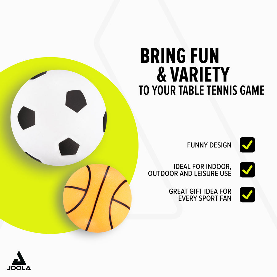 The JOOLA BALLSET SPORTS brings fun and variety to your table tennis game! These fun balls in a sports design are ideal for indoor, recreational, and outdoor use. Featuring designs reminiscent of football, basketball, baseball, and billiards, they ensure entertaining matches. This set also makes a great gift idea for table tennis and sports enthusiasts.