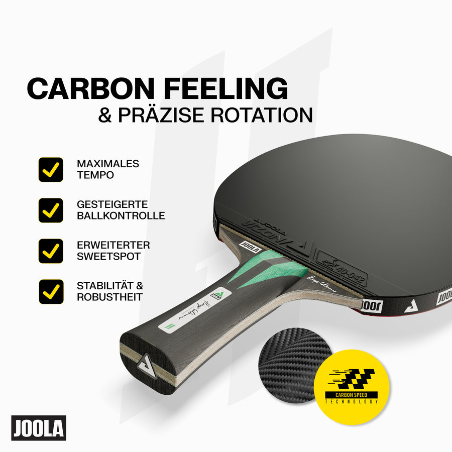 The JOOLA Hugo Calderano Carbon is the ideal choice for ambitious players who want to shape their attacking game with speed and spin. With powerful VIZON rubbers, dynamic SPEED DRIVE technology, and balanced weight distribution, this racket supports fast and controlled offensive play.