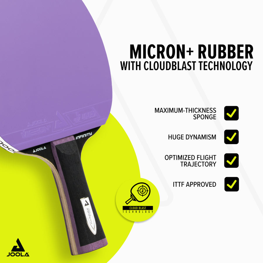 ITTF-approved MICRON+ rubbers – combined with extra-thick CLOUDBLAST sponge for catapult effect and topspin power.