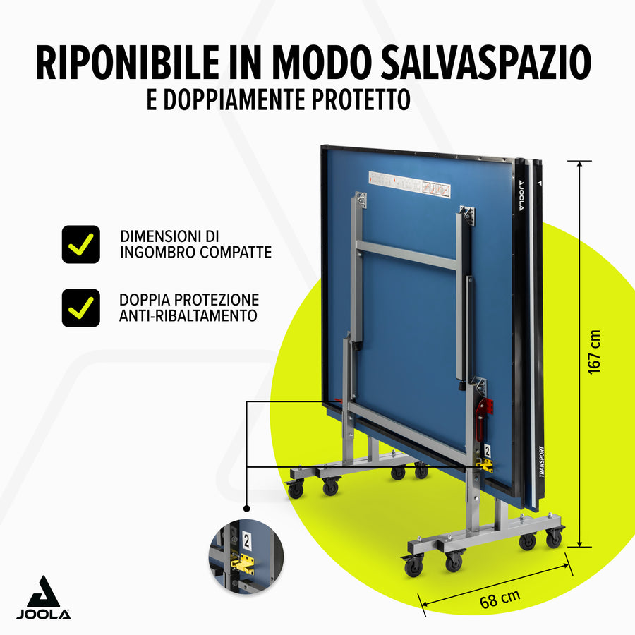The JOOLA Transport table tennis table offers an excellent combination of stability, user-friendliness, and transportability. With its high-quality 19 mm surface and versatile applications, it is ideal for hobby players, clubs, and schools.