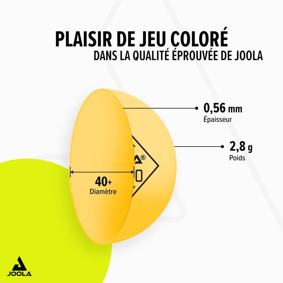 Le set JOOLA COLORATO ajoute une touche de fun à vos parties de tennis de table. Avec ses balles unies et bicolores, vous améliorez votre jeu tout en vous amusant. La rotation visible des balles bicolores offre un vrai avantage pour progresser. Que vous jouiez en plein air ou à l’intérieur, vous serez toujours bien équipé.