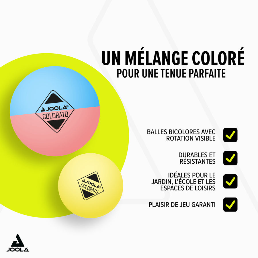 Le set de balles JOOLA COLORATO, composé de 6 balles unies et de 6 balles bicolores, apporte de la couleur à vos parties de ping-pong ! Que ce soit dans la cour d'école ou au jardin, avec les balles JOOLA COLORATO tendance, vous avez toujours une longueur d'avance. Les versions bicolores permettent aussi de mieux visualiser la rotation de la balle et d'améliorer vos réflexes de jeu.