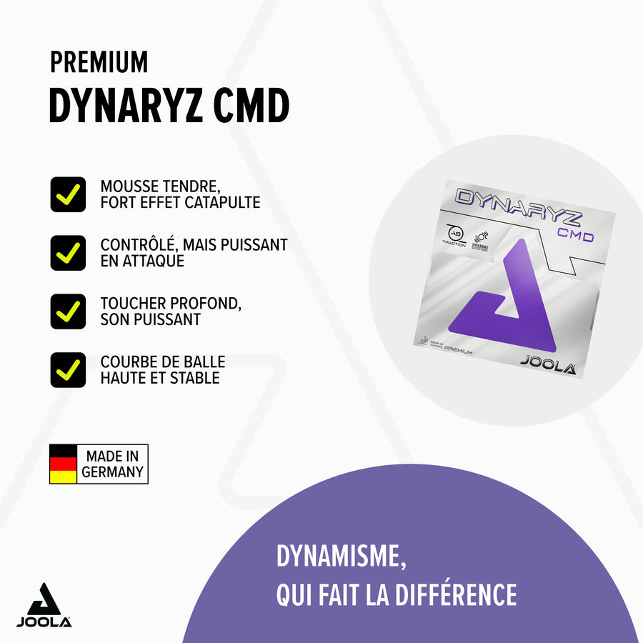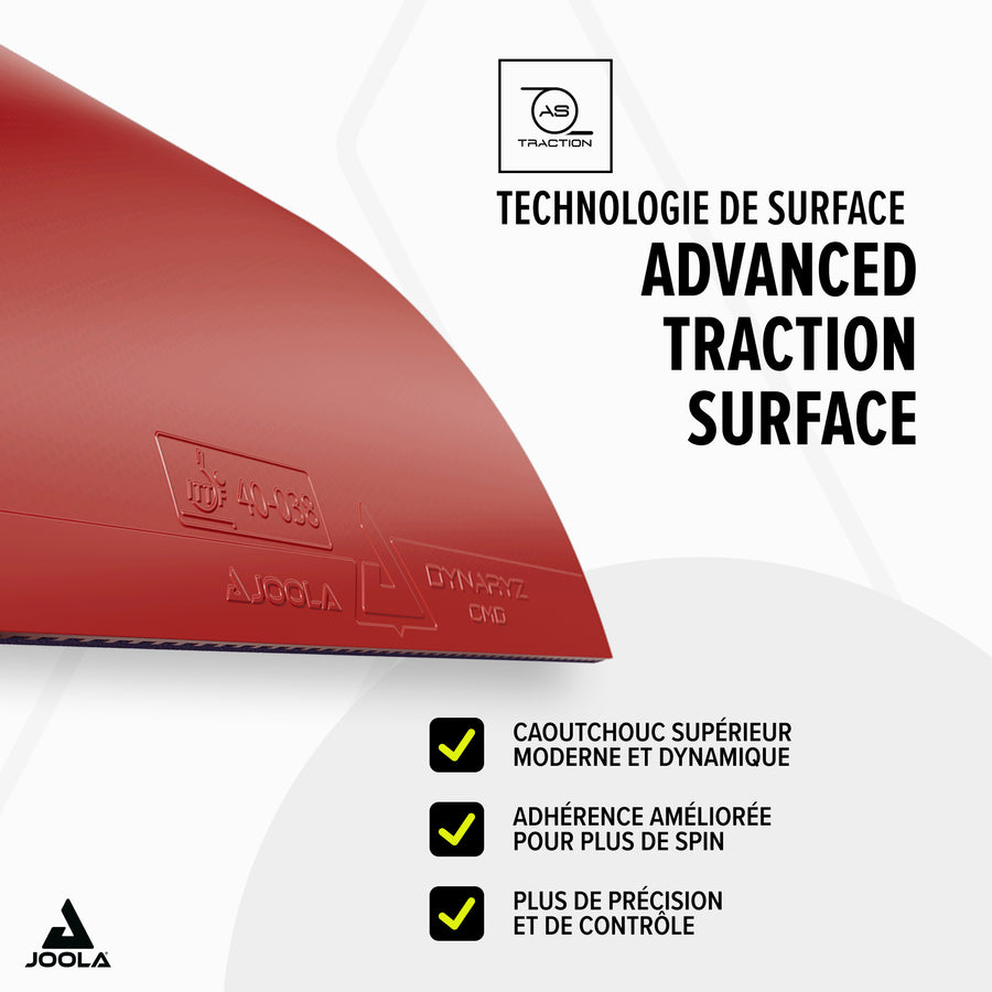 JOOLA DYNARYZ CMD est doté d'une mousse tendre de 43°, offrant un toucher agréable et un son impressionnant. Habituellement, les revêtements tendres sacrifient vitesse et rotation au profit du contrôle. Mais la haute qualité du caoutchouc ADVANCED TRACTION et de la mousse HYPER BOUNCE permet de déjouer cette règle. Ce qui rend JOOLA DYNARYZ CMD intéressant pour les attaquants de tous niveaux.
