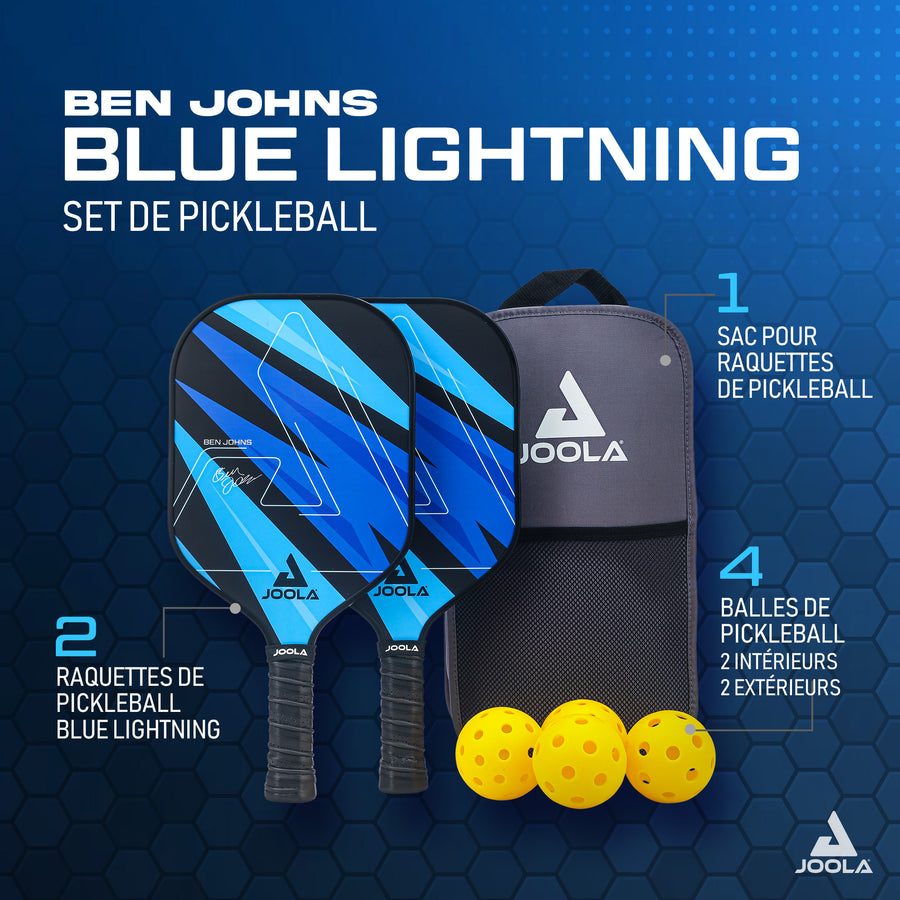 Le JOOLA Ben Johns Blue Lightning Pickleball Set est le pack de démarrage parfait pour les nouveaux joueurs de pickleball. Avec un équipement de qualité et des accessoires pratiques, vous êtes prêt à jouer et à améliorer votre jeu dès maintenant.