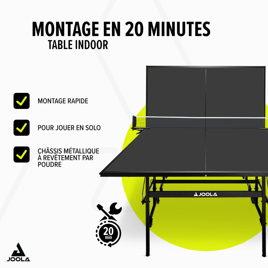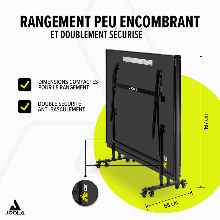 La table de tennis de table JOOLA BLACK 13i séduit par sa finition soignée, ses excellentes qualités de jeu et son design noir élégant et épuré. Son plateau de 12 mm assure un rebond homogène et un jeu agréable. Grâce à ses deux moitiés rabattables séparément, elle permet facilement de passer en mode solo. Équipée d’un double système anti-basculement, de roulettes verrouillables et de pieds réglables en hauteur, elle garantit une surface de jeu stable. Préassemblée à 95 %, elle se monte en seulement 15 minutes. Un filet avec système de pince est inclus pour commencer immédiatement à jouer.