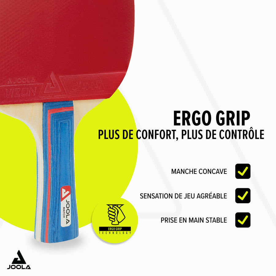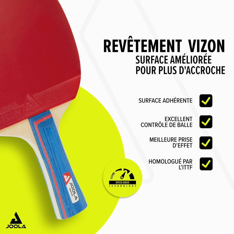 - 2 raquettes JOOLA Match : les raquettes sont équipées de revêtements JOOLA Vizon 2.0 mm homologués ITTF, offrant d’excellentes caractéristiques de spin et de vitesse.