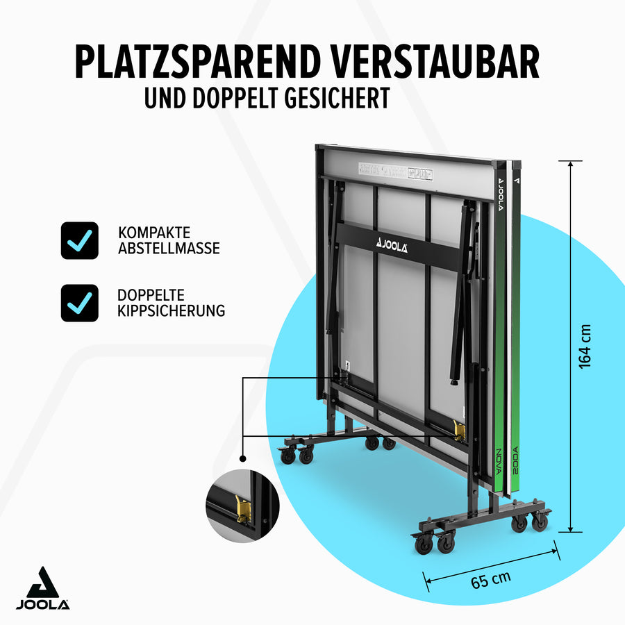La table de ping-pong extérieure JOOLA Nova 200A est la solution idéale pour tous ceux qui ne veulent faire aucun compromis en extérieur. Avec son plateau résistant de 6 mm, ses équipements bien pensés et son dégradé vert-noir moderne, elle allie performance sportive et véritable adaptation à l'extérieur.