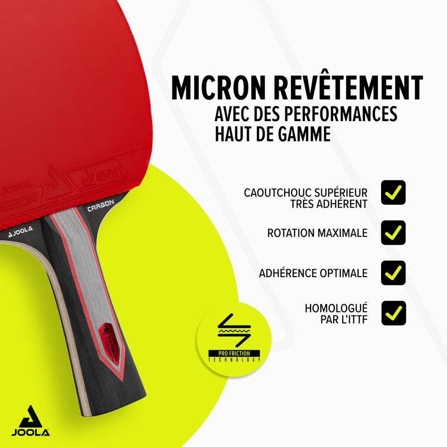 - Revêtements JOOLA Micron approuvés ITTF – Très adhérents pour un spin maximal et des échanges rapides.