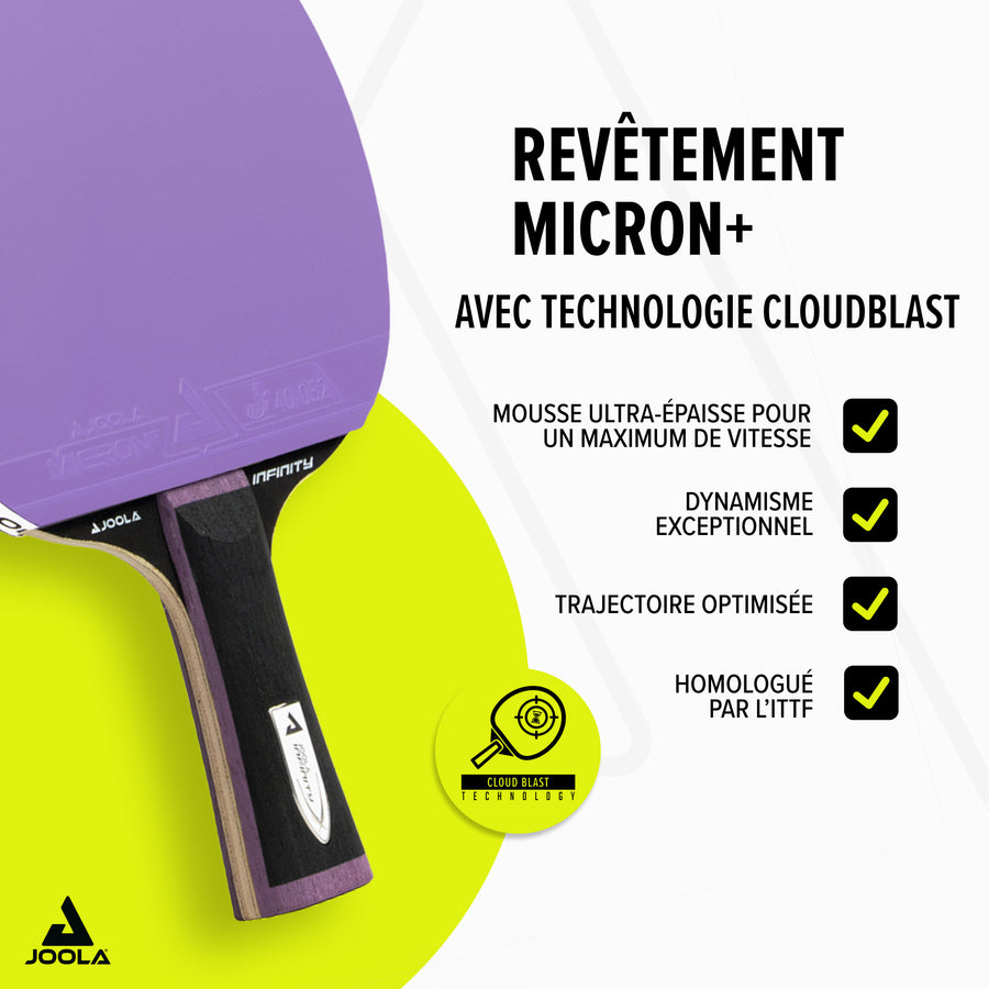 Revêtements MICRON+ homologués ITTF – associés à une mousse CLOUDBLAST extra épaisse pour un effet catapulte et une puissance de topspin exceptionnelle.